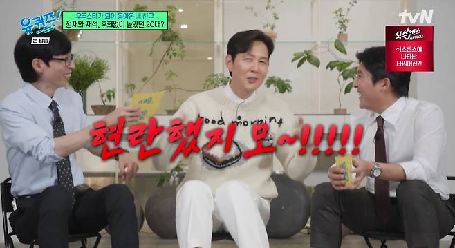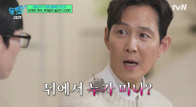 유재석은 "저도 20대 때 많이 놀았다"라고 하자 이정재는 "현란했지. 술은 안마시지만"라며 유재석을 놀렸다.