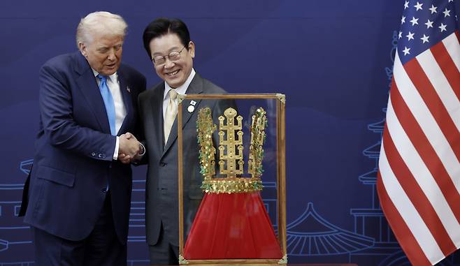 | ▲ '천마총 금관 모형'과 한미 정상 이재명 대통령이 29일 경북 경주박물관에서 도널드 트럼프 미국 대통령에게 '천마총 금관 모형'을 선물한 뒤 악수하고 있다. |