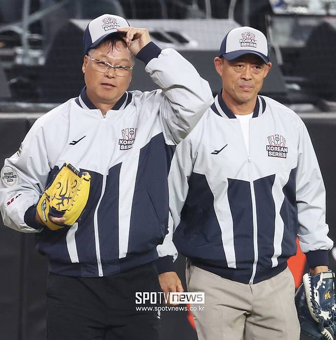 구대성 감독과 조경택 코치는 29일 대전 한화생명 볼파크에서 열린 2025 신한 SOL뱅크 KBO 한국시리즈 한화와 LG의 3차전에서 시구와 시포를 맡았다.