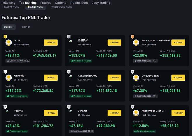 30일 세계 1위 가상자산 거래소인 바이낸스의 선물거래 랭킹에는 한국 국적 가상자산 선물투자자 '워뇨띠(온라인 닉네임)'의 새 계정으로 알려진 'ILLIT'(아일릿)이 이번주 주간 거래 PNL(손익)이 194만5063달러(약 27억6900만원)으로 1위를 나타냈다.