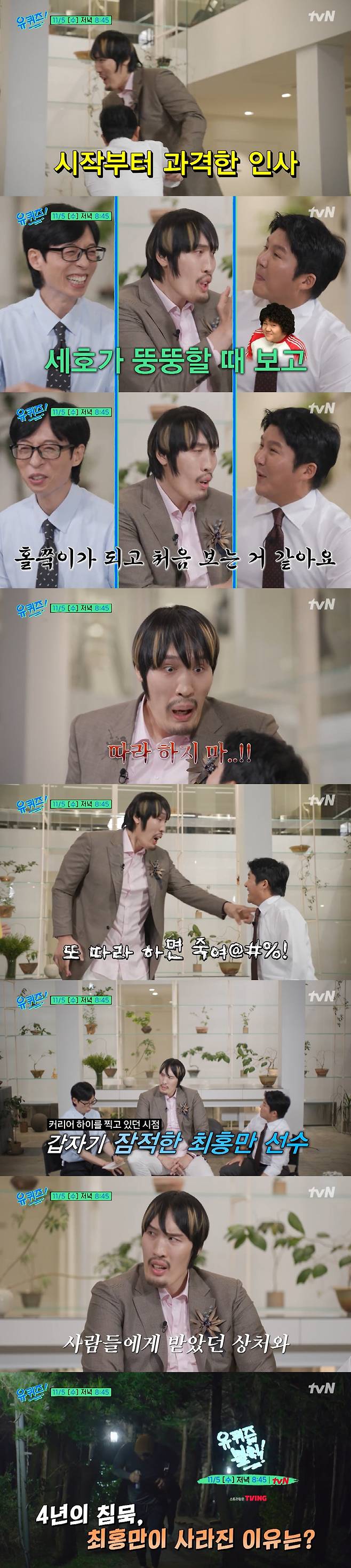 유재석이 "홍만 씨가 '유퀴즈' 나온다고 SNS에 올렸다고 들었다"라고 하자, 최홍만은 조세호에게 "너 왜 '좋아요' 안 눌렀냐"라고 물었다. 이에 조세호는 "형도 제 거 안 누르지 않냐"라고 황당해 했고, 최홍만은 "내가 형이잖아!"라고 대답해 웃음을 안겼다.