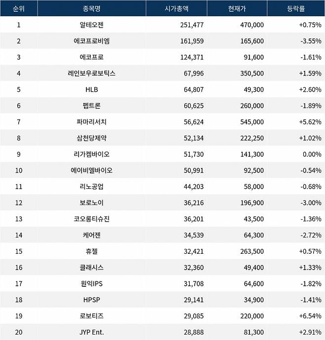 30일 한국거래소에 따르면, 시가총액 1위 알테오젠(196170)은 현재가 470,000원으로 전 거래일 대비 0.75% 상승하고 있다.