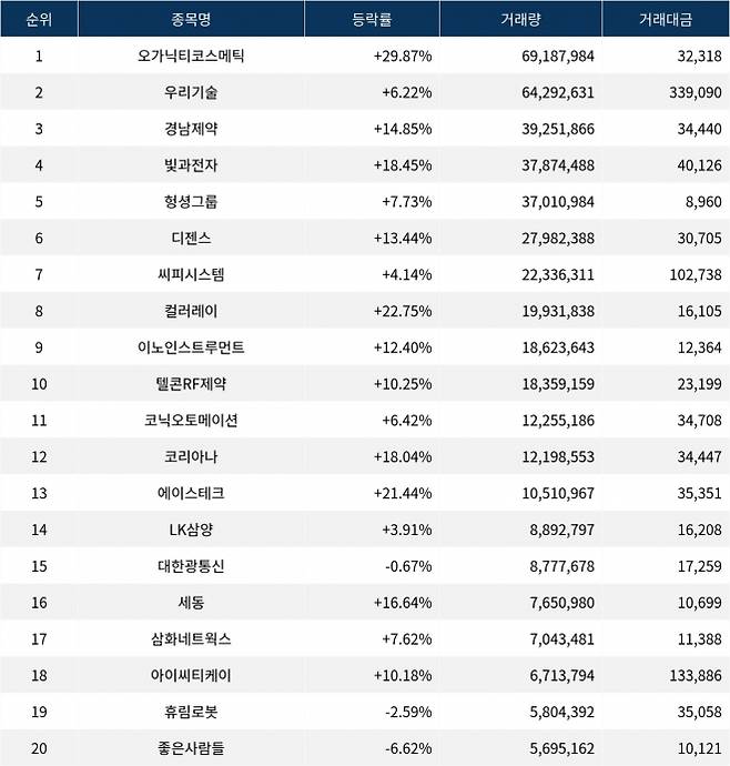 한편 거래량 상위 20위권 종목들은 코닉오토메이션(391710) ▲6.42%, 코리아나(027050) ▲18.04%, 에이스테크(088800) ▲21.44%, LK삼양(225190) ▲3.91%, 대한광통신(010170) ▼0.67%, 세동(053060) ▲16.64%, 삼화네트웍스(046390) ▲7.62%, 아이씨티케이(456010) ▲10.18%, 휴림로봇(090710) ▼2.59%, 좋은사람들(033340) ▼6.62% 등의 성적을 기록했다.