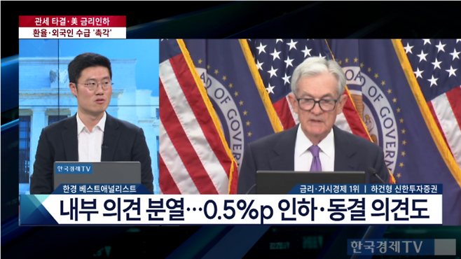 하건형 신한투자증권 연구위원은 30일 한국경제TV에 출연해 "시장이 10월 인하에 이어 12월까지 신호가 나올 거라 기대했지만 파월 의장의 발언은 한 차례 더 지켜보겠다는 쪽에 가깝다"며 "연방준비제도(Fed·연준) 내부에서도 동결 의견이 나온 만큼 속도 조절이 불가피해 매파적 인하로 해석할 수 있다"고 말했다.