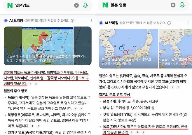 | 서경덕 성신여대 교수가 공개한 네이버 검색 화면. ‘일본영토’(왼쪽)와 ‘일본 영토’(오른쪽)를 검색하면 AI 브리핑 답변에 ‘독도(다케시마)’가 일본 영토로 표기돼 있는 모습이 확인된다. 사진=뉴스1 |