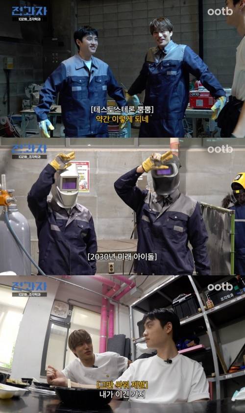 이날 두 사람이 듣게 된 강의는 바로 조각 이론과 금속조 실습. 이에 카이와 도경수는 도경수가 출연하는 디즈니+의 오리지널 시리즈 '조각도시'에서 영감을 받아 극 중 도경수가 연기하는 ‘요한’의 얼굴이 새겨진 빌딩 조형물 제작에 나선다. 생애 처음 금속 조형 작품에 도전하게 된 두 사람은 “작업장에 오니까 남자 느낌이 나네”라며 거친 매력을 과시하는가 하면, “너무 재밌다!”를 연발하며 작품 제작에 몰입한다. 용접면을 착용한 직후에는 “무대 의상 같다”라며 즉석에서 ‘러브 샷(Love Shot)’ 안무를 추는 등 ‘2030년 미래 아이돌’로 완벽 변신해 웃음을 유발한다.