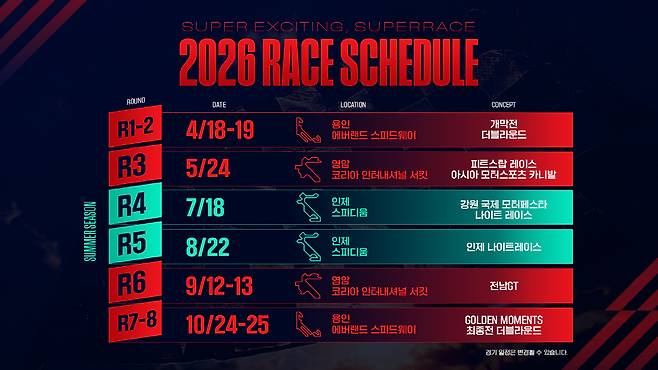 1~2라운드(2026년 4월 18~19일)와 7~8라운드(10월 24~25일)는 용인 에버랜드 스피드웨이에서, 3라운드(5월 24일)와 6라운드(9월 12~13일)는 전남 영암 코리아인터내셔널서킷에서 각각 열릴 예정이다. 그리고 4~5라운드(7월 18일, 8월 22일)는 강원도 인제군 인제스피디움에서 나이트레이스로 펼쳐진다.