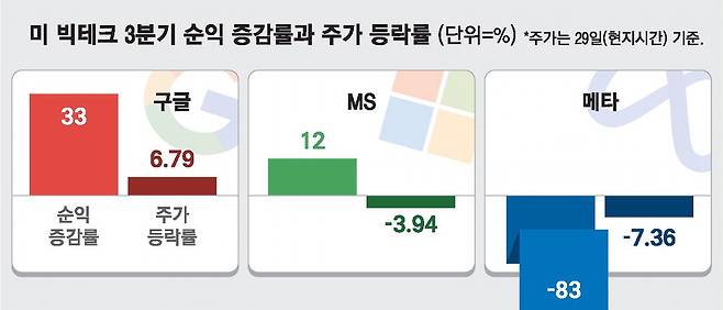 글로벌 빅테크 기업인 구글, 마이크로소프트(MS), 메타가 올해 3분기(7~9월) 인공지능(AI) 성장세에 힘입어 일제히 시장 예상을 뛰어넘는 실적을 내놨다. 그러나 막대한 비용 투자가 부담으로 작용하며 MS와 메타 주가는 오히려 시간 외 거래에서 급락했다.