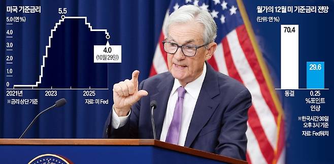 미국 중앙은행(Fed)이 29일(현지시간) 연방공개시장위원회(FOMC)에서 예상대로 기준금리를 0.25%포인트 인하했다. 하지만 제롬 파월 의장이 “12월 금리 인하는 기정사실이 아니다”고 밝히면서 시장 분위기가 냉각됐다. 당초 시장에선 12월 기준금리 인하를 예상했지만 파월 의장의 발언이 ‘매파적’(통화긴축 선호)으로 해석되면서 시장에선 12월 금리 동결 확률이 70% 이상으로 높아졌다.