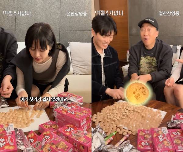 공개된 영상 속에는 영화 '어쩔수가없다'의 손예진, 이성민, 염혜란, 박희순 등은 다 같이 모여 요즘 유행하는 놀이 칸쵸깡(과자 칸쵸에서 자신의 이름 찾기)을 하는 모습이 담겨 있다.
