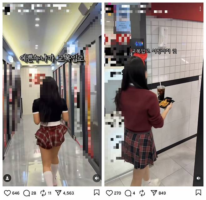 해당 업체는 인스타그램 계정에 여성 직원의 교복 착용을 강조한 광고 영상(릴스) 2개를 게시했다. 지난 9월 게시된 한 영상에는 "예쁜 누나가 교복 입고 서빙까지 해준다니 대박"이란 내레이션이, 2월 게시된 다른 영상에는 "교복 입고 서빙하는 PC방이 있다?", "예쁜 알바생분들이 교복 입고 서빙까지?"라는 자막이 광고에 삽입됐다. 두 영상 모두 여성 직원들이 짧게 수선한 교복 차림으로 음식을 나르거나 카트를 끄는 모습이 담겼다. 일부 직원은 리본 머리띠를 쓴 모습이었다.