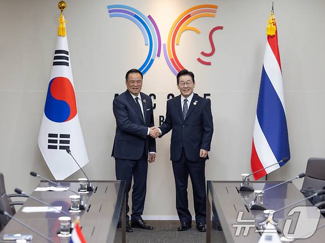 (서울=뉴스1) 허경 기자 = 이재명 대통령과 아누틴 찬위라꾼 태국 총리가 30일 경북 경주 APEC 정상회의장에서 열린 양자회담에 앞서 악수하고 있다. (대통령실 제공. 재판매 및 DB 금지) 2025.10.30/뉴스1