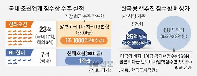 30일 업계에 따르면 핵추진 잠수함은 척당 건조 비용이 수조원에 달하고, 작전·훈련·정비 순환을 전제로 최소 3척 이상을 발주하는 것이 일반적이다. 조선업계 입장에선 수십조원 규모의 신규 시장이 열리는 셈이다. 강경태 한국투자증권 연구원은 “미국 버지니아급 공격핵잠수함(SSN), 콜롬비아급 탄도미사일핵잠수함(SSBN)의 척당 평균 선가가 68억 달러”라며 “첫 개발인 점을 감안해도 한국형 핵잠수함 초도함 건조 비용은 25억 달러(약 3조 5663억원)로 추정된다”고 설명했다.