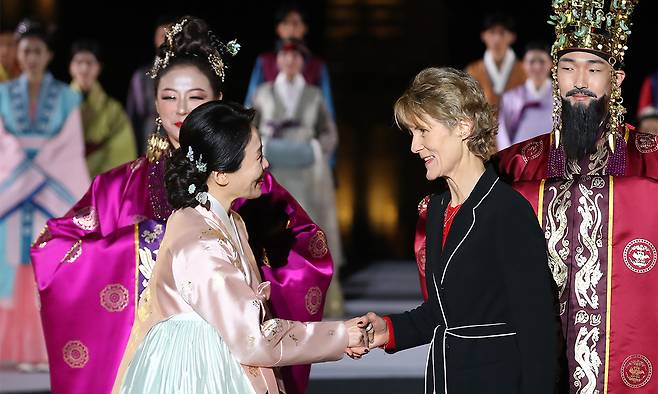 김 여사는 30일 한·캐나다 정상회담 맞춰 마크 카니 캐나다 총리의 배우자인 다이애나 폭스 카니 여사와 국립경주박물관에서 환담을 나눴다. 이 대통령과 카니 총리의 정상회담에서 협력과 문화 교류 확대 등이 언급된 만큼 김 여사와 카니 여사도 양국 문화 등에 대한 대화를 나눴을 것으로 보인다.