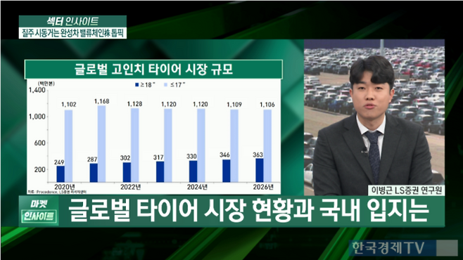 이병근 LS증권 연구원은 30일 한국경제TV에 출연해 "글로벌 타이어 시장 자체는 큰 성장을 기대하기 어렵지만 18인치 이상 고인치 타이어는 연 5% 이상 성장이 가능하다"며 "SUV와 전기차 판매 확대가 고인치 수요를 끌어주고 있어 국내 업체들도 믹스 개선 효과를 누릴 것이다"고 말했다.
