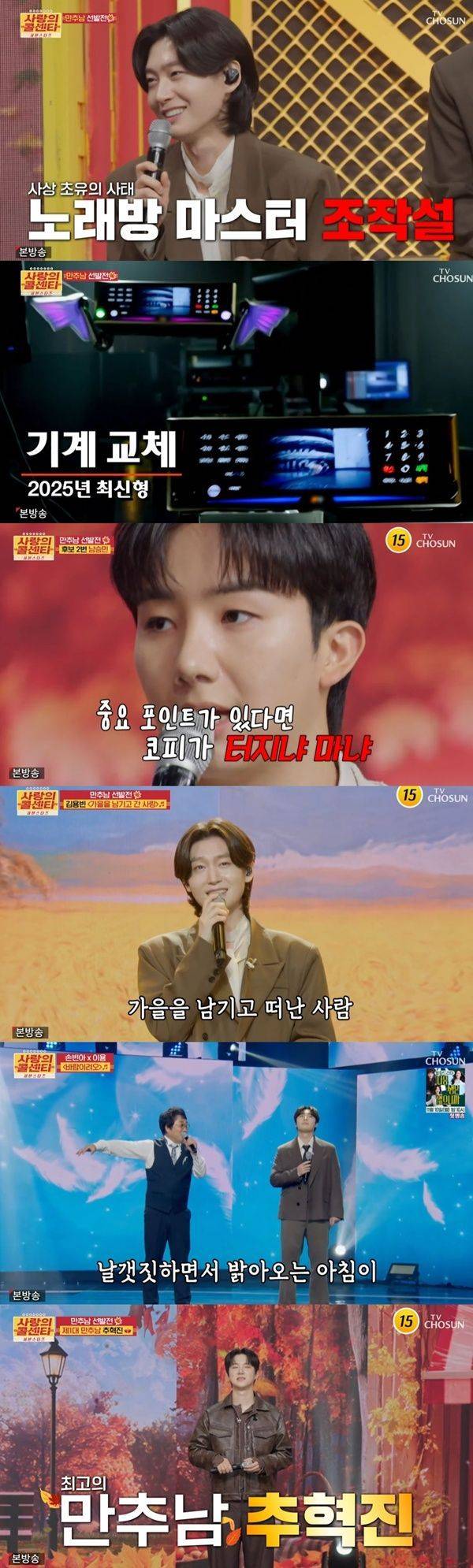 '최고의 만추남' 선발전이 시작되기 전, 김용빈은 6연속 97점에 대해 의심을 품으며 "노래방 마스터가 조작인 것 같다. 무조건 교체를 해야한다"고 해 웃음을 안겼다.