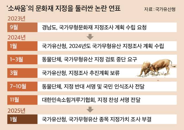 하지만 동물단체가 반발하면서 국가유산청은 2024년 3월 보류 결정을 내렸고, 올 1월 “연구용역을 바탕으로 논의한 결과 민속놀이로서 가치는 일정 부분 인정되나, 인류 보편의 가치 등을 고려해 국가무형유산 신규 종목 지정 조사를 하지 않겠다”고 공식화했다.