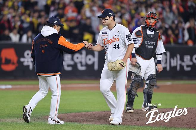 김서현이 3점 차 이내, 세이브를 올릴 수 있는 상황에 마운드를 오른 건 지난 1일 SSG 랜더스와의 정규시즌 최종전이었다. 이 경기에서 그는 5-2로 앞선 상황에서 투런홈런 2개를 맞고 한화의 끝내기 패전, 1위 탈환 실패 빌미를 제공한 바 있다.