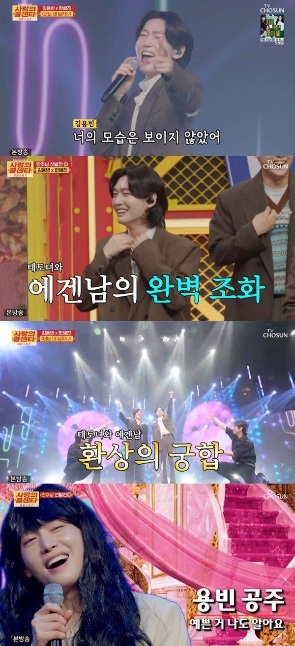 김용빈은 한혜진과 '너는 내 남자'로 스페셜 듀엣 무대를 꾸몄다. 붐은 "테토녀와 에겐녀의 만남"이라고 두 사람을 소개해 웃음을 안겼다.