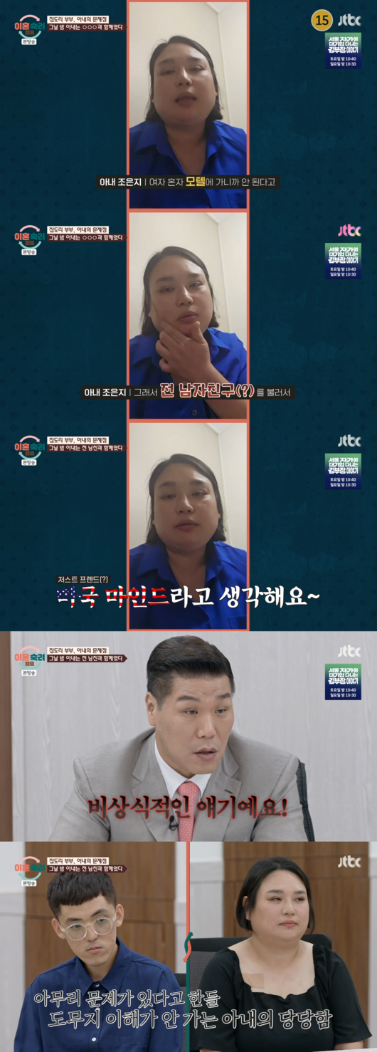 아내는 숙박을 위해 모텔에 묵으려고 했으나 "여자 혼자 묵는 게 안 된다고 해서 전 남자친구를 불렀다"는 믿기 어려운 이야기를 전했다. 즉, 부부 관계가 파탄 난 상황에서 전 남자친구를 불러 함께 밤을 보냈음을 스스로 시인한 것이다.