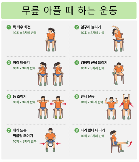 무릎이 아플 때 하는 운동으로는 체중이 실리지 않는 것이 좋다. 실내 자전거나 물속 걷기는 허벅지 근육 강화에 효과적이다. 통증이 심하면 온찜질 20분이나 자주 주무르기가 도움이 된다.