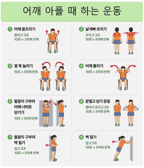 무리하지 않는 범위에서 가벼운 스트레칭 위주로 시행한다. 척추는 바로 세우고 배꼽을 등쪽으로 당기며 가슴 펴는 연습을 한다. 하루에 2회 실시하는 온찜질이 도움이 된다.