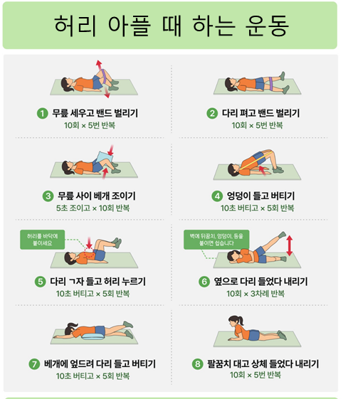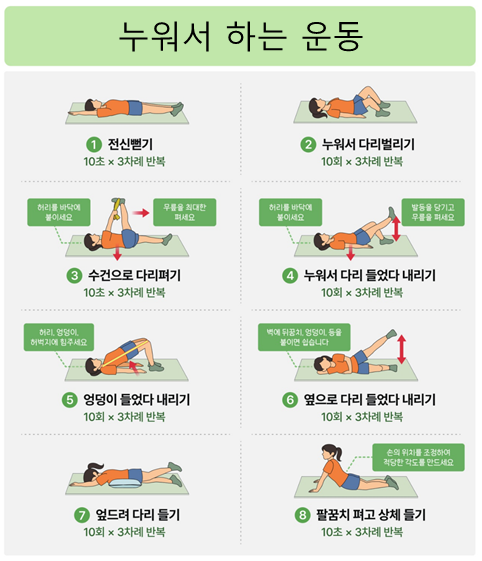 누워서 하는 운동과 비슷하지만 몸의 코어 근육을 강화하는 것이 골자다. 하루에 두 차례 실시하며, 장시간 방바닥에 앉지 않아야 한다. 평상시에도 허리를 펴고 배꼽 아래를 등쪽으로 당기고 엉덩이를 조이는 느낌을 주고 걷거나 앉아있도록 노력하는 게 좋다.