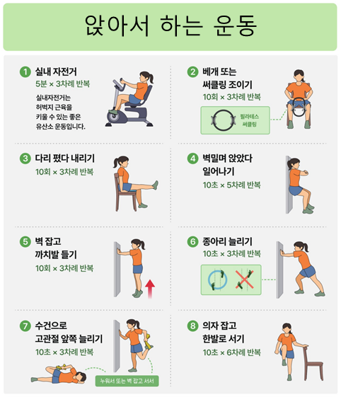 만일 관절이 아파 서 있기 힘들 때 의자에 앉아 쉽게 따라 할 수 있다. 하루 두 차례 정도 실시가 적당하다. 너무 오래 앉아 있으면 엉덩이 근육이 약해지니 오래 앉는 것은 피해야 한다. 수영장에서 물 속에 걷는 것도 도움이 된다.