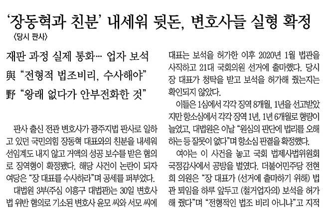 판사 출신인 두 사람은 2019년부터 2020년까지 입찰 담합 혐의로 구속된 철거업자에게 '사건 담당 판사와의 친분을 내세워 보석 허가 등을 받게 해주겠다'며 성공보수 명목으로 2억 2000만원을 받은 혐의로 기소됐다. 이때 이들이 친분을 내세운 판사가 당시 광주지법 부장판사였던 장동혁 국민의힘 대표다.