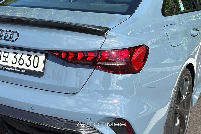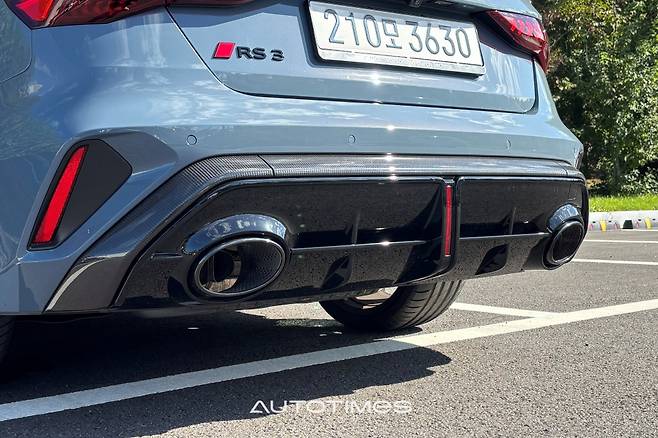 뒤는 그래픽 구성을 바꾼 테일램프를 통해 신형다운 존재감을 알린다. 또 에디션의 특징인 카본 파츠들로 일부 꾸몄다. 두툼한 일체형 스포일러 립은 물론 범퍼 주변의 모습이 대표적이다. 커다란 두 개의 배기구는 우렁찬 소리를 들려주고 경주차처럼 중앙에는 후방 반사등도 넣었다. 또 트렁크 끝에 붙은 RS3 배지는 오너로서 자부심을 높이는 포인트가 된다.