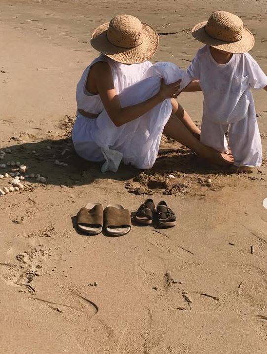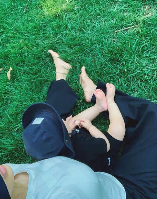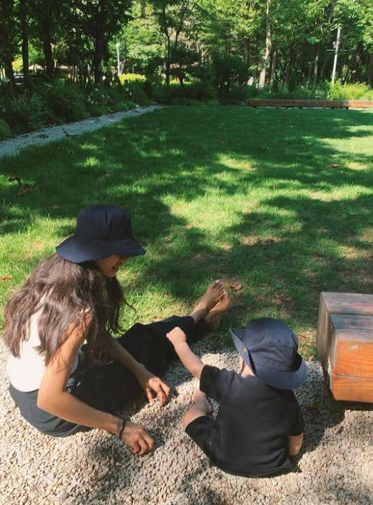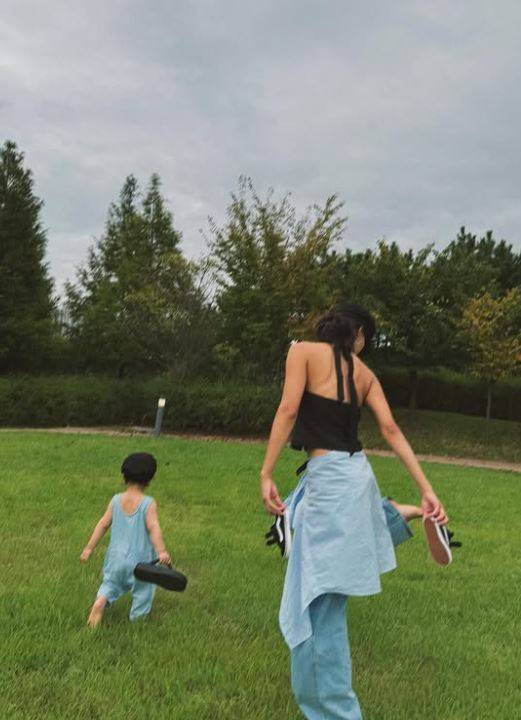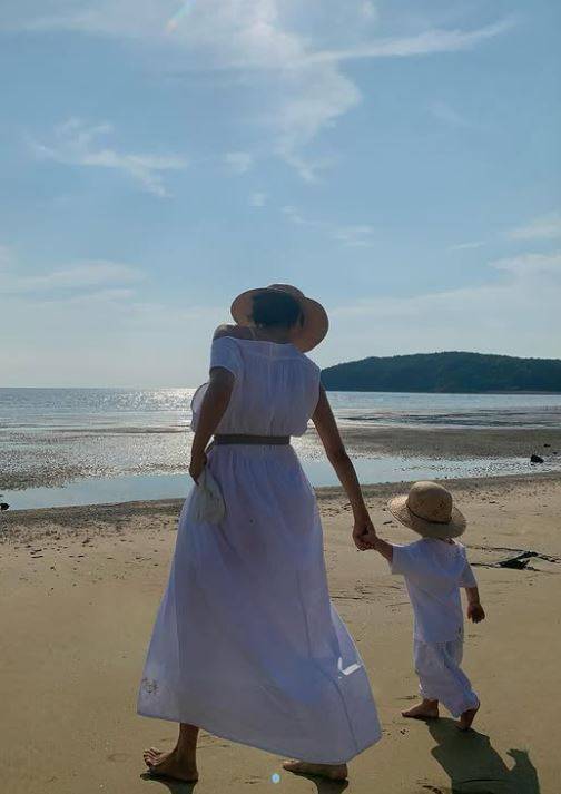 아이의 손을 잡고 해변가를 거닐고, 풀밭에 앉아 여유를 즐기는 등 행복한 모습이다. 또한 모델답게 센스 넘치는 시밀러룩으로도 눈길을 끌었다.