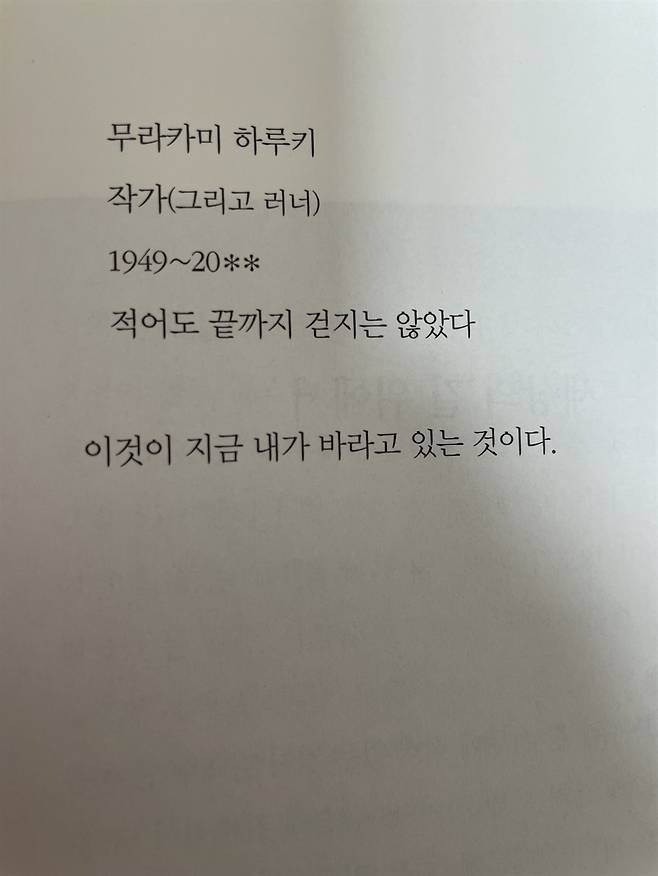 | ▲ 무라카미 하루키 <달리기를 말할 때 내가 하고 싶은 이야기> P.259 묘비명 같은 것이 있다면, 그는 이렇게 써넣고 싶다고 한다. |