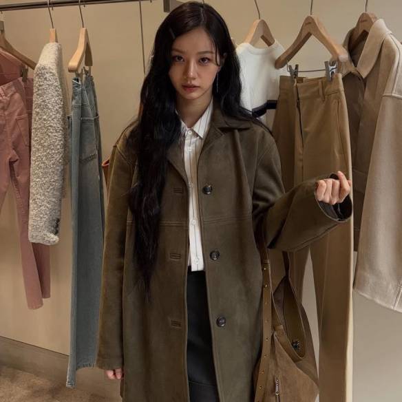 스웨이드 싱글브레스트 코트로 가을 룩을 완성한 혜리. 인스타그램 @hyeri_0609