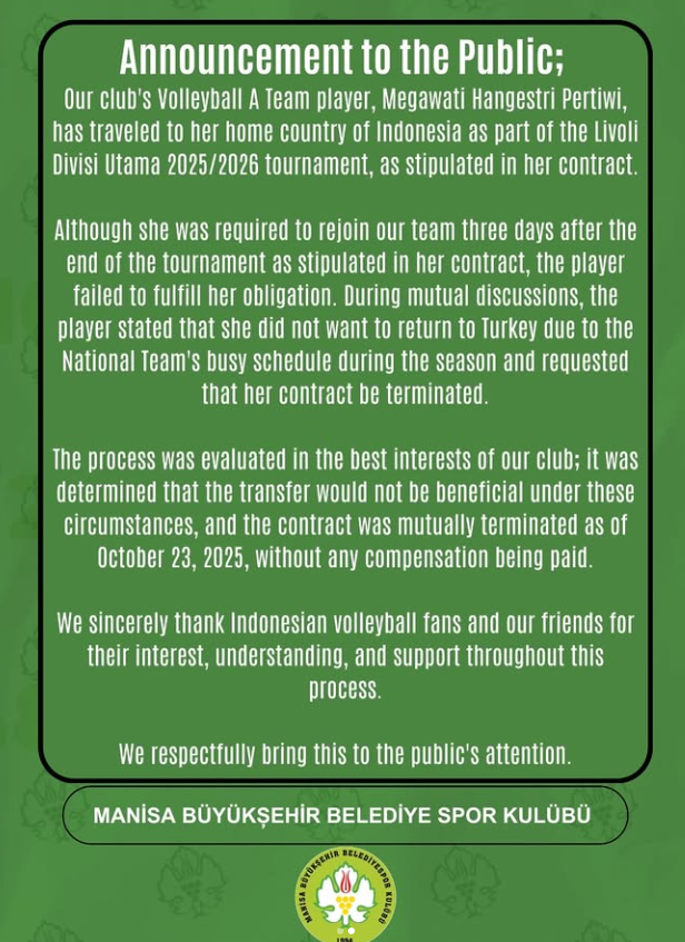 지난 29일(현지시간) 튀르키예 2부 리그 '마니사 BBSK'는 공식 SNS를 통해 "우리 A팀 선수 중 한 명인 메가가 자국 인도네시아 리볼리 디비전 2025-26시즌 토너먼트를 소화하기 위해 떠났다"며 "선수는 대회 종료일 이후 3일 안에 우리 팀에 복귀해야 하는 의무를 이행하지 않았다. 선수는 시즌 중 국가대표팀 일정(2025 SEA 게임)이 바빠 튀르키예로 복귀를 원치 않는다며 계약 종료를 요구했다"고 전했다.