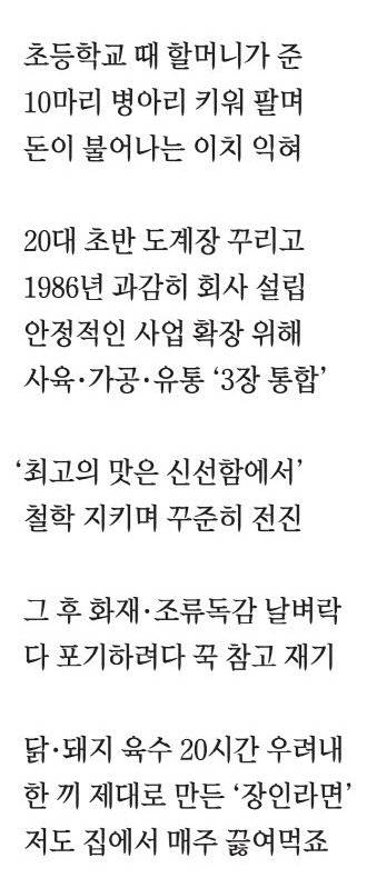 자산 규모 17조원의 하림을 이끄는 김홍국 회장이 매주 즐겨 먹는다는 음식은 보기보다 소박했다. "요즘은 집에서 우리 회사 제품인 '더미식(The미식) 장인라면'을 매주 먹습니다. 먹고 나면 속이 편안하거든요. 닭 육수로 반죽한 면에 닭고기와 사골, 돼지 뼈를 넣고 20시간 이상 진하게 우려낸 액상스프를 쓰죠. 향미제로 맛을 흉내 낸 라면들과 확실히 다릅니다. 진짜 국물인 데다 한 끼로 손색이 없어요."