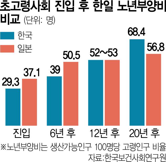 올해 우리나라가 65세 인구가 전체 인구의 20% 이상인 초고령사회에 공식 진입한 가운데 12년 뒤인 2037년에는 노년 부양비가 일본을 추월할 것으로 전망됐다. 아직은 일본은 물론 경제협력개발기구(OECD) 평균보다는 낮은 수준이지만 급속한 고령화로 복지 지출이 급증할 것으로 보여 재정 위험 관리가 시급하다는 지적이 나온다.