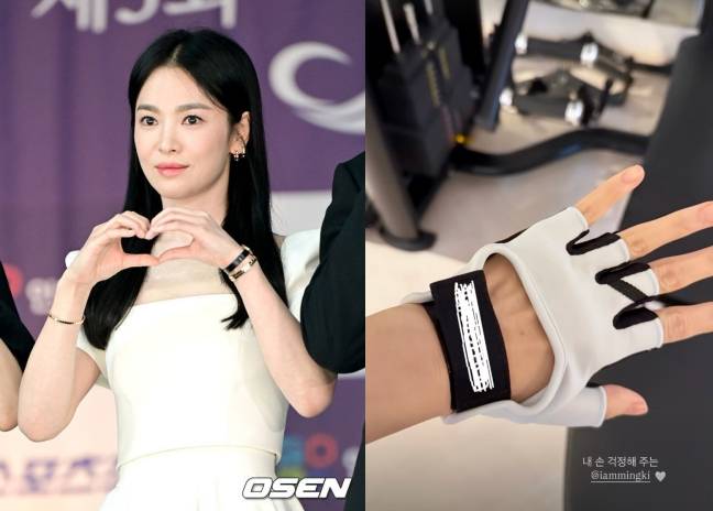 공개된 사진에는 송혜교와 강민경의 이름이 나란히 적혀 있는 사물함과 운동용 장갑 한쌍이 담겨 있었다. 또 송혜교는 운동에 앞서 선물받은 장갑을 끼고 직접 인증에 나서지고 했다. 강민경이 선물해 준듯 강민경의 SNS 아이디를 태그하며 고마움과 애정을 전했다.