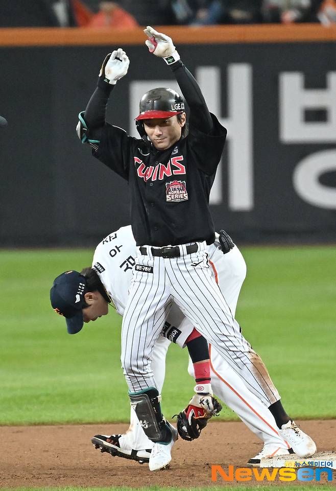 LG는 전날 열린 4차전에서 극적인 역전승을 거뒀다. 9회초에만 6점을 얻어내며 7-4 대역전승에 성공했다. 8회 와이스를 상대로 역전의 시발점이 된 2루타를 기록했던 신민재는 "안타가 아니더라도 출루를 해서 연결하면 좋겠다는 생각으로 타석에 들어섰다"고 당시를 돌아봤다.
