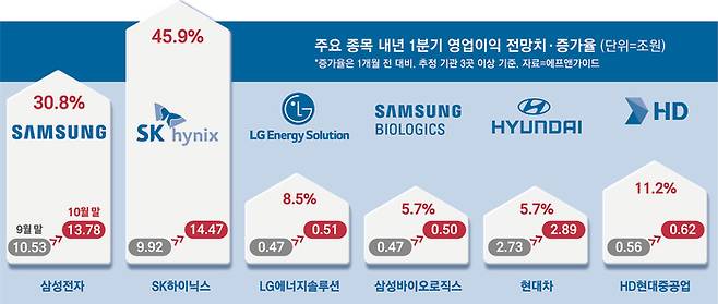 36조1354억원은 지난 9월 말 증권사 연구원들이 전망한 내년 1분기 8개 초대형주의 영업이익에 비해 29.2%(8조1679억원)나 늘어난 수치다. 개별 종목별로도 모두 전망치가 상향됐다.