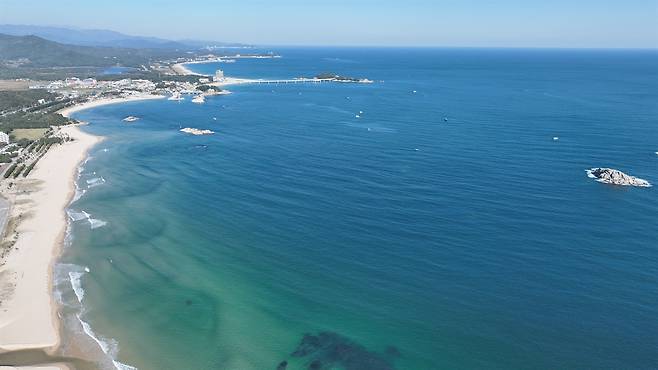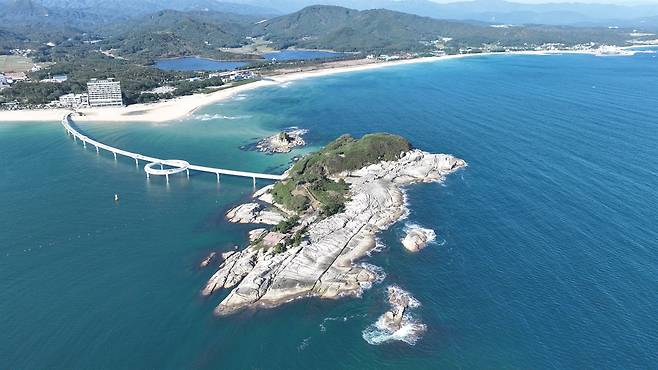 | ▲ 고성 삼포해변에서 바라본 죽도 거대한 다리 아래로 섬의 실루엣이 드러나며, 개발의 그늘 속에서도 여전히 해변의 아름다움을 간직한 모습 |
