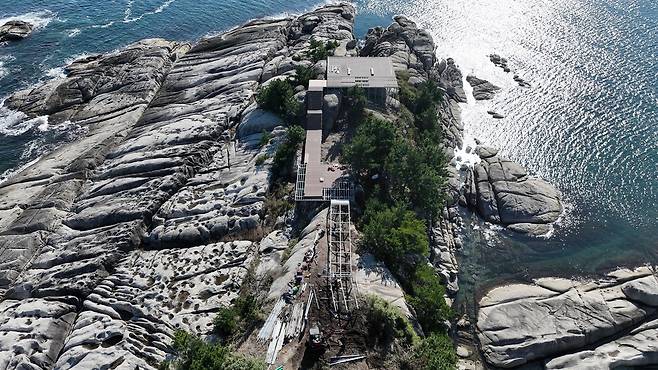 | ▲ 암반 위에 설치된 목재 데크 자연 암반을 덮은 인공 구조물이 섬의 생태를 위협하고 있다.(2025/10/29) |