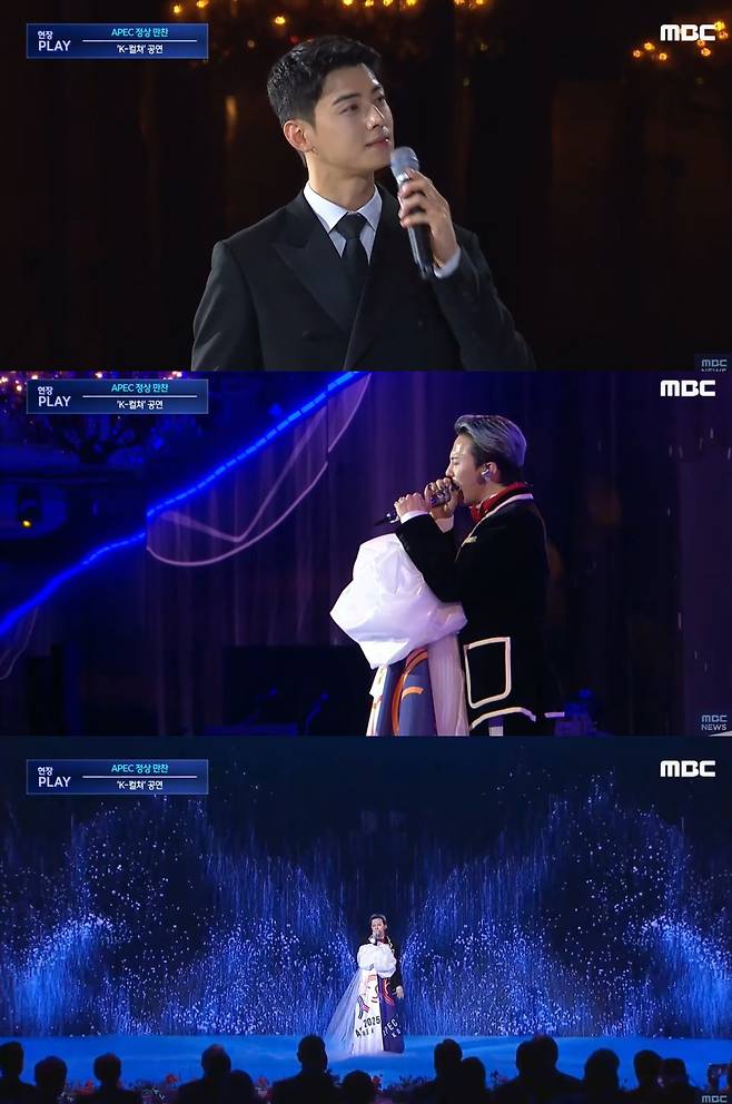 (엑스포츠뉴스 오승현 기자) 가수 차은우와 지드래곤(GD, 권지용)이 APEC 정상회의 만찬 무대에 등장했다.