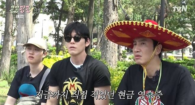 화려한 멕시코 여행룩을 완성한 이광수, 김우빈, 도경수. 가게에서 영수증을 받지 않은 김우빈은 "알려주신 대로 작성해서 드리면 되냐. 이런 곳은 영수증을 안 준다"라고 물었다. 그러나 제작진은 "저희가 만들어준 영수증을 그 분한테 받아야 한다"라고 했고, 김우빈은 "제가 적어서 드리는 게 아니고요?"라며 지금까지 직접 적었다고 당황했다.