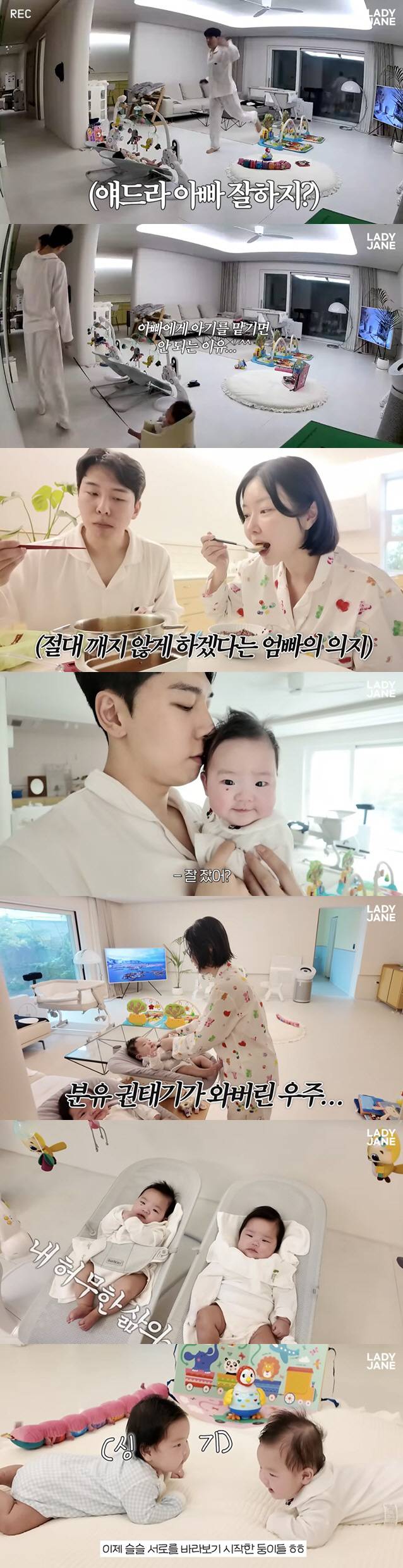 가수 레이디제인이 남편과의 쌍둥이 육아 일상을 공개했다.