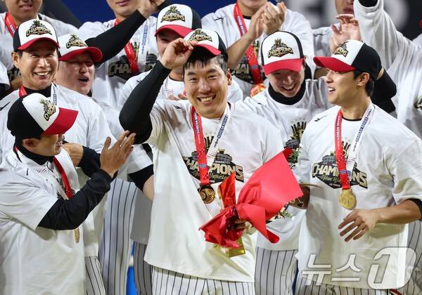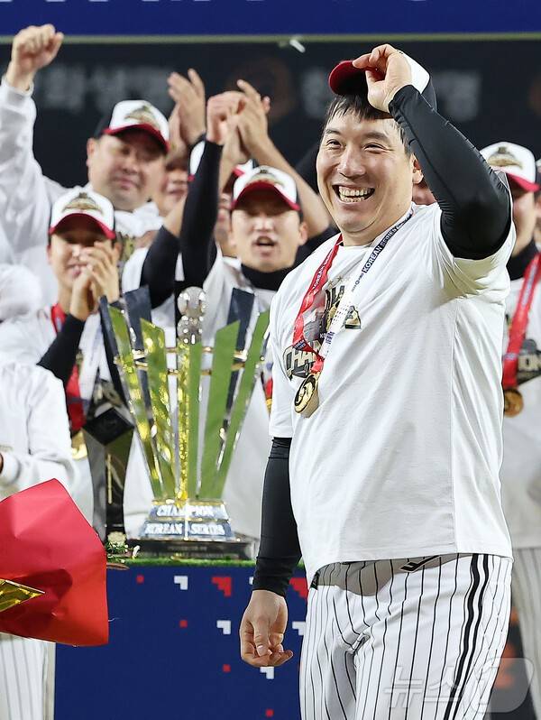 [SPORTALKOREA] 한휘 기자= 17년 전, 한국시리즈 마지막 경기에서 병살타를 치고 펑펑 울던 20살의 어린 선수가 있다. 그로부터 긴 시간이 지났다. 고참이 된 그 선수는 이제 밝은 얼굴로 당당히 'MVP' 팻말을 들어 올렸다.