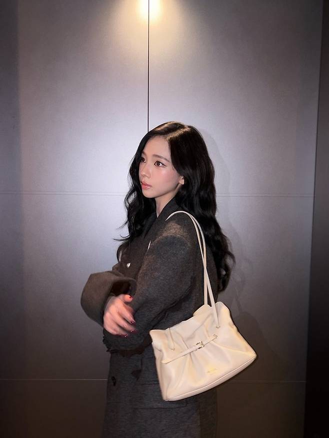 또 다른 컷에서는 복도 벽을 배경으로 다양한 포즈를 선보였고, 여기에 크림 컬러의 소프트한 토트백과 블랙 힐을 매치해 세련된 스타일링을 완성했다.