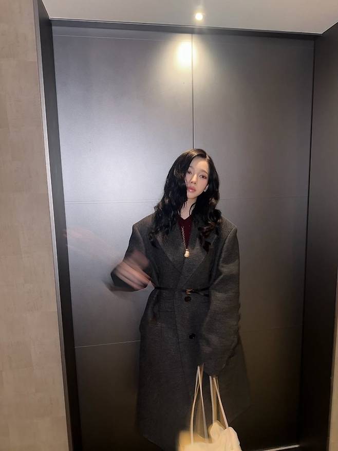공개된 사진 속 그는 볼륨감 있는 웨이브 헤어에 그레이 톤의 벨티드 롱코트를 착용한 채 거울 셀카를 찍는 모습이다.