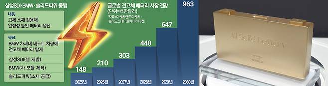 문제는 가격이다. 전고체 배터리 제조비용은 액체 기반 리튬이온 제품보다 3~5배 높은 것으로 분석된다. 전고체 전지를 만드는 데 필요한 시설 비용도 리튬이온 전지에 비해 10~20배 더 많을 것으로 추산된다. 이 때문에 아직까지 전고체 배터리를 실제로 탑재한 전기차는 등장하지 않았다. 삼성SDI, BMW, 솔리드파워의 ‘삼각 동맹’이 이 같은 기술·비용 장벽을 넘겠다는 전략이다.