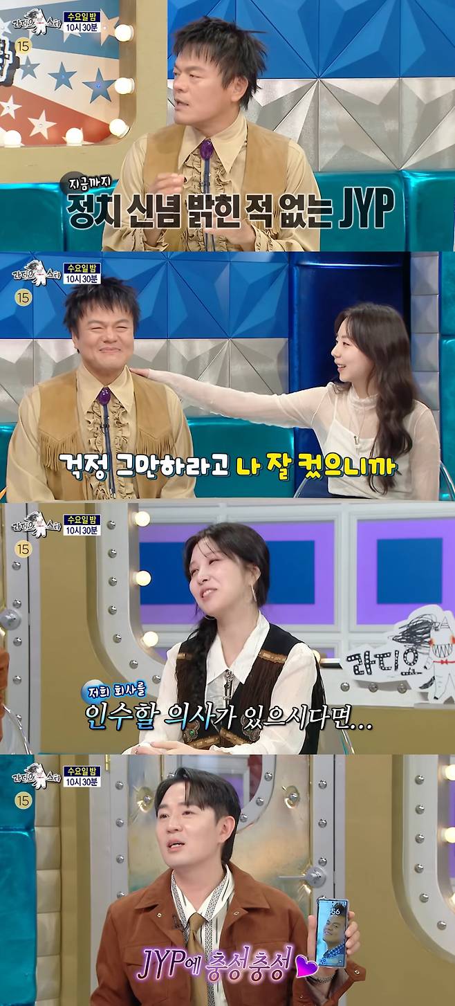 그런가 하면 지난 2월 신생 기획사 어나더와 전속계약을 체결한 권진아는 "우리 회사를 인수할 의사가 있으시다면.."이라며 박진영에게 깜짝 제안했다. 이를 들은 유세윤은 "인수해 달라고?"라며 놀라워했고, 김구라는 "야망 있는 친구"라며 폭소했다.