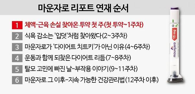 의료계 난제였던 비만 치료의 길이 열리고 있다. 포만감 유지와 식욕 억제에 영향을 주는 GLP-1(글루카곤 유사 펩타이드 1형) 계열 치료제의 등장 덕이다. 최근 국내에 출시된 '마운자로'는 GIP(위 억제성 폴리펩타이드)와 GLP-1 이중 작용제로 기존 치료제 대비 더 높은 체중감량 효과와 당뇨·MASH(대사이상 간질환) 등 복합 대사질환 치료제로서의 진화를 보여주고 있다. 다만, 치료제가 단순 미용 목적으로 오남용되거나 '기적의 다이어트 주사'로 오인하는 사회적 풍토는 경계해야 할 부분이다. 이번 연재는 고도비만 판정을 받은 기자가 직접 투여 과정을 체험하며 효과와 부작용, 생활습관 변화 등을 기록하고 올바른 비만 치료제 사용과 건강한 삶을 고민해보자는 취지에서 총 6회(12주 간)에 걸친 연재로 기획됐다. 기자가 겪은 마운자로 효능을 모두가 똑같이 겪지 않는다. 부작용을 동반하는 비만치료제 사용을 염두에 둔 독자들이라면 반드시 의사와 상의하길 바란다.
